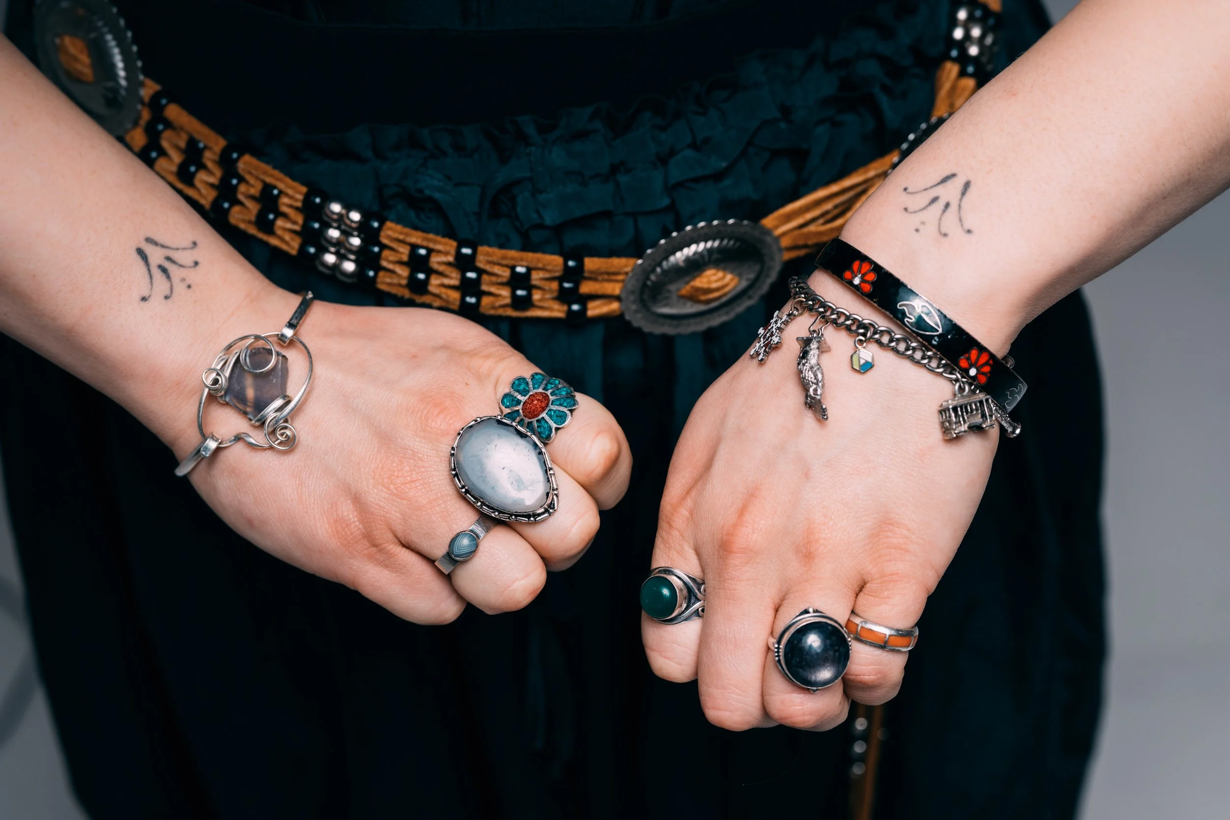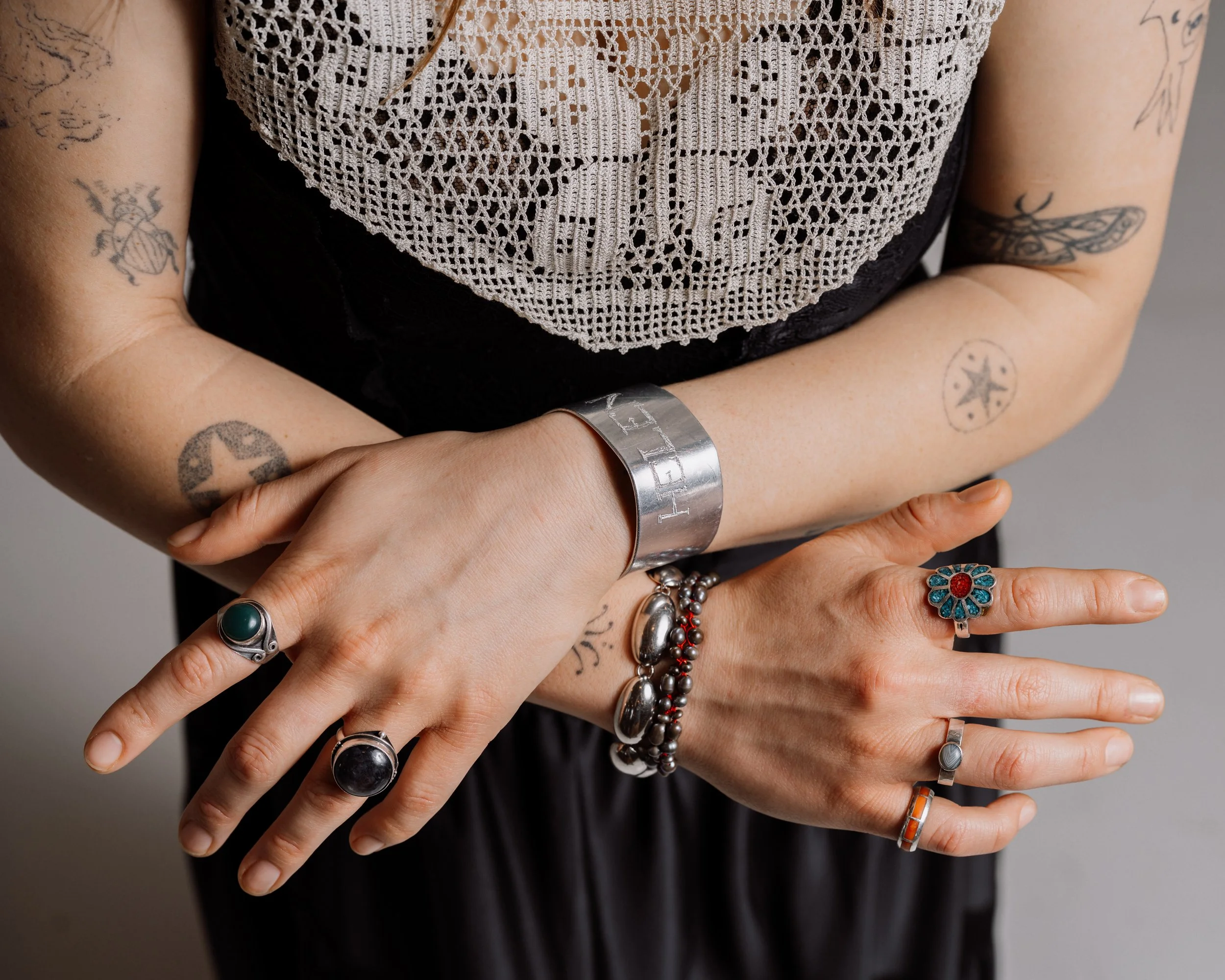 Sophie started wearing rings in fifth grade because of Ringo, her favorite Beatle. Ringo is a bit goofy and bubbly, so the circular orbs and bracelets make her think of the peaceful, serendipitous vision of lying back on Lake Superior and breaking in the bubbles from the waves. The Helen bracelet was found in a Goodwill bin and is a curveball to the outfit. You can tell that it’s hand engraved, and janky, but it’s a subtle nod to punk.
