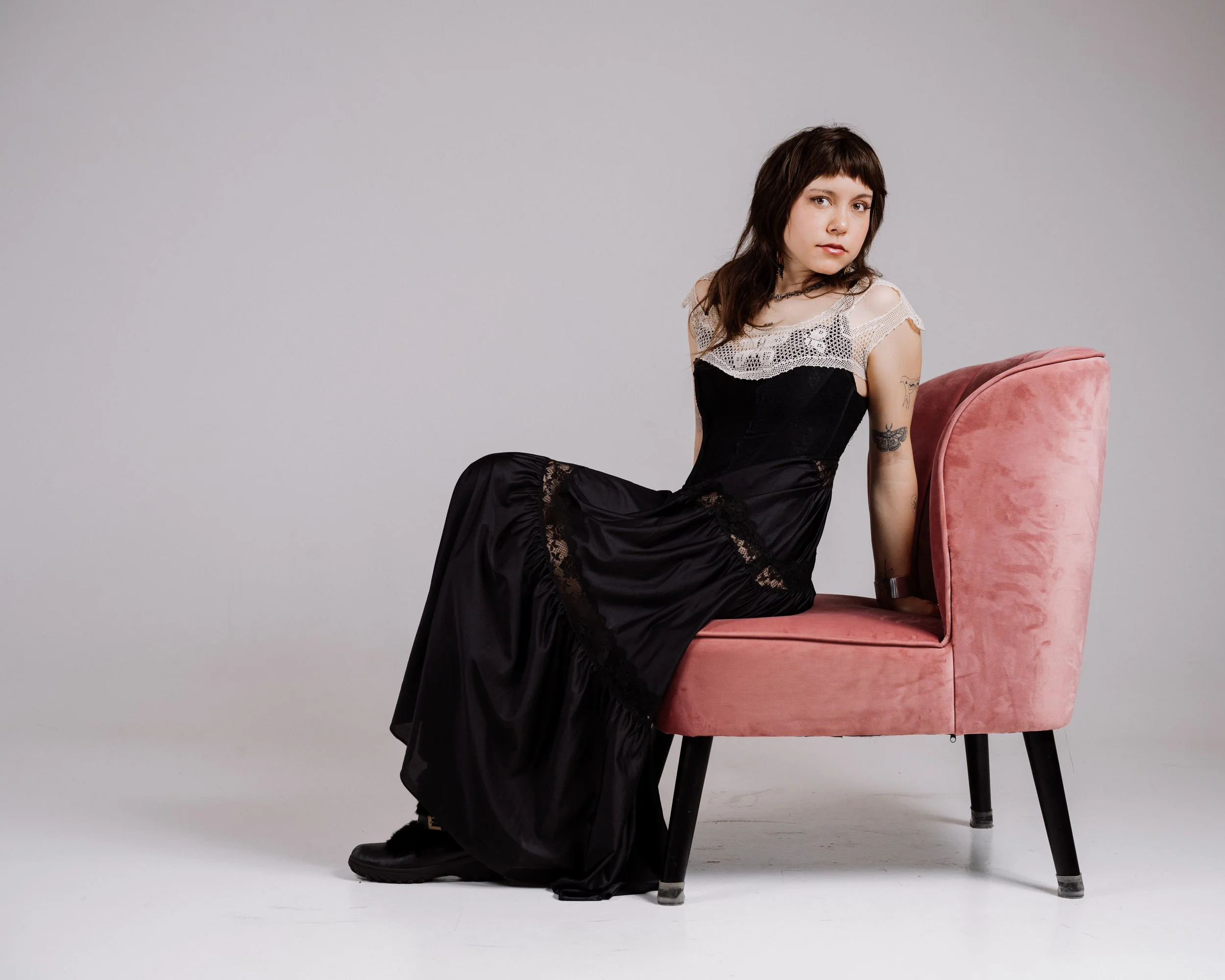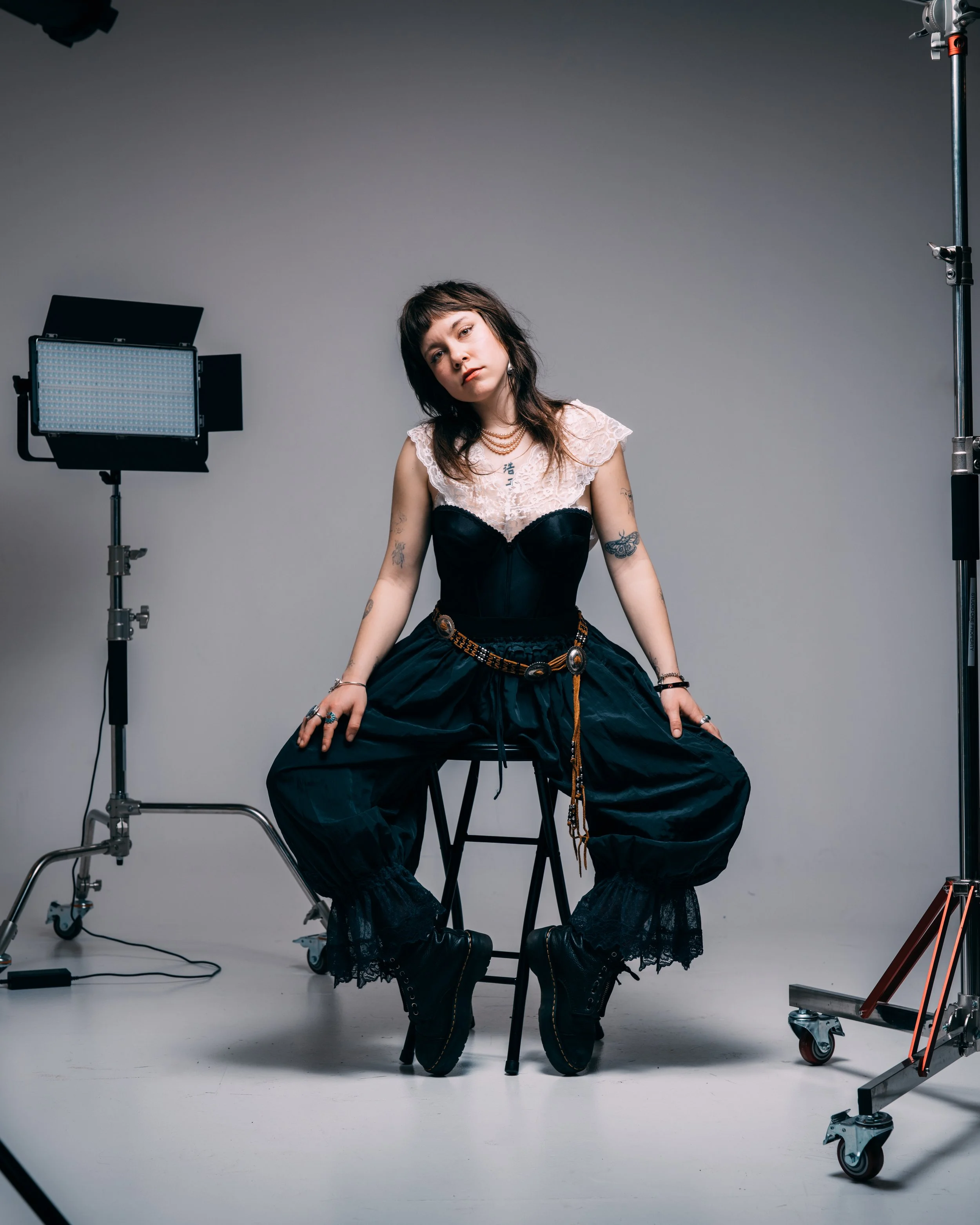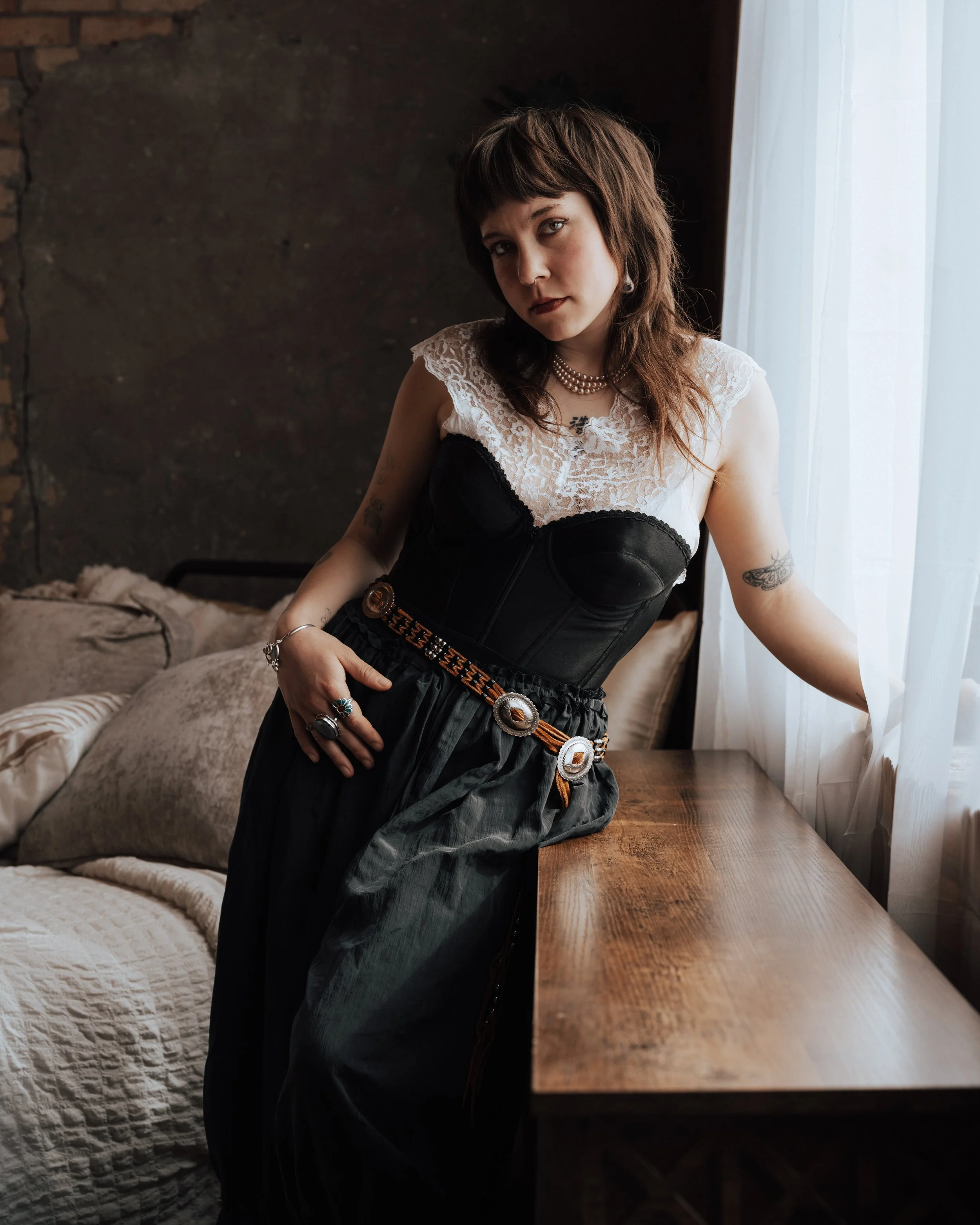 Moving to the Twin Cities expanded her perspective even more. Minneapolis offered more access, more inspiration, and more freedom to experiment. Where Duluth shaped her sense of texture and restraint, the cities opened up a broader range of references. Her style began to stretch into something more expressive, pulling in elements of grunge, art school aesthetics, and opening up her theatrical influences. Those influences are easy to trace. There’s a looseness and rawness that echoes artists like Nirvana or Patti Smith, balanced by a romantic edge that often feels closer to Courtney Love. At the same time, there’s an appreciation for structure and design that hints at more conceptual fashion influences. What makes it work is that none of these references feel copied. They’re absorbed and reinterpreted, filtered through her own instincts.