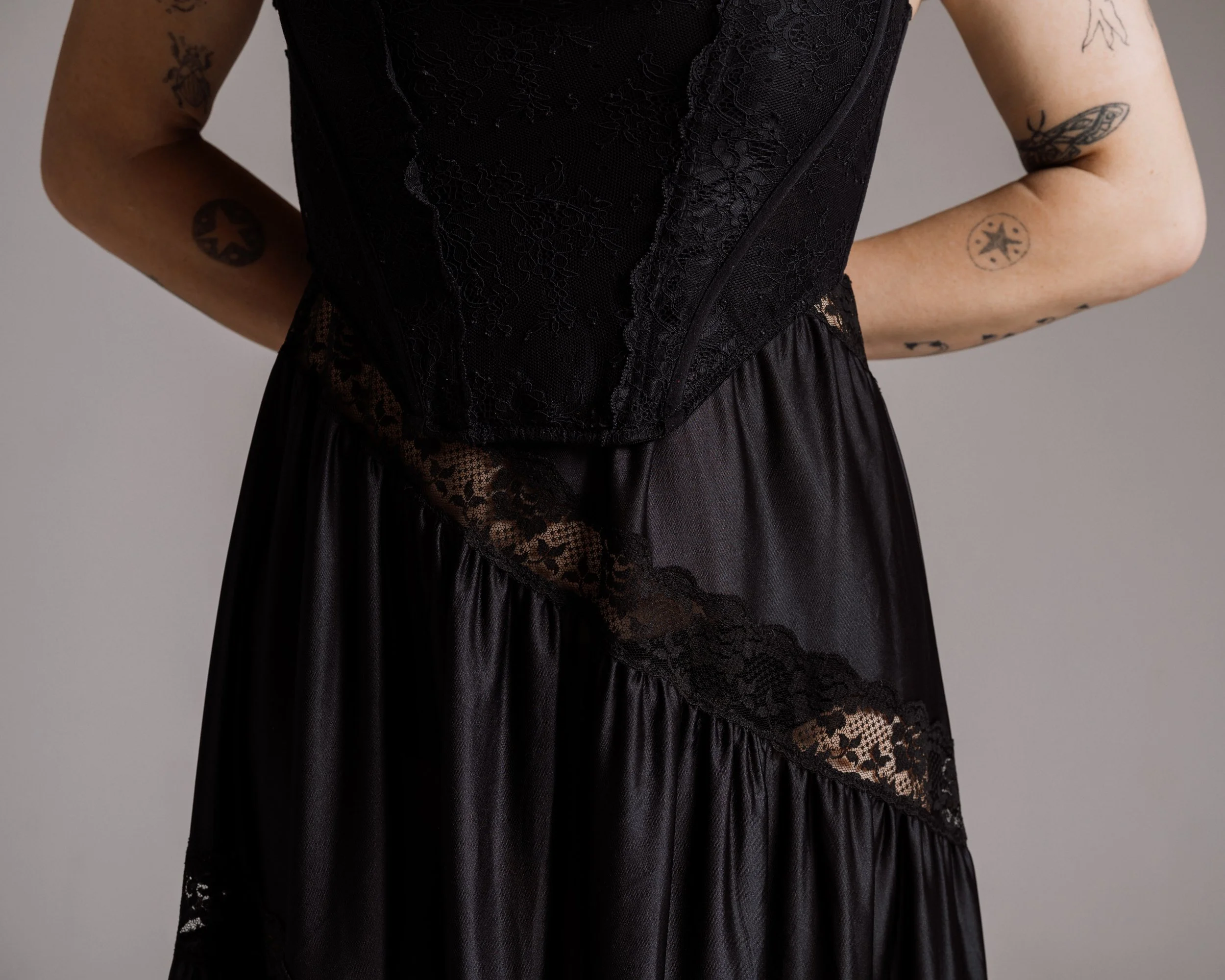 The black laces dress has a spiral cutout around it, giving slivers of intricate mesh. Sophie received this from a friend and it makes her think of her early punk band. It feels like it’s something Courtney Love would wear. You can see that mojo embodied into her posing and stances, owning the space and carrying that air of empowerment.