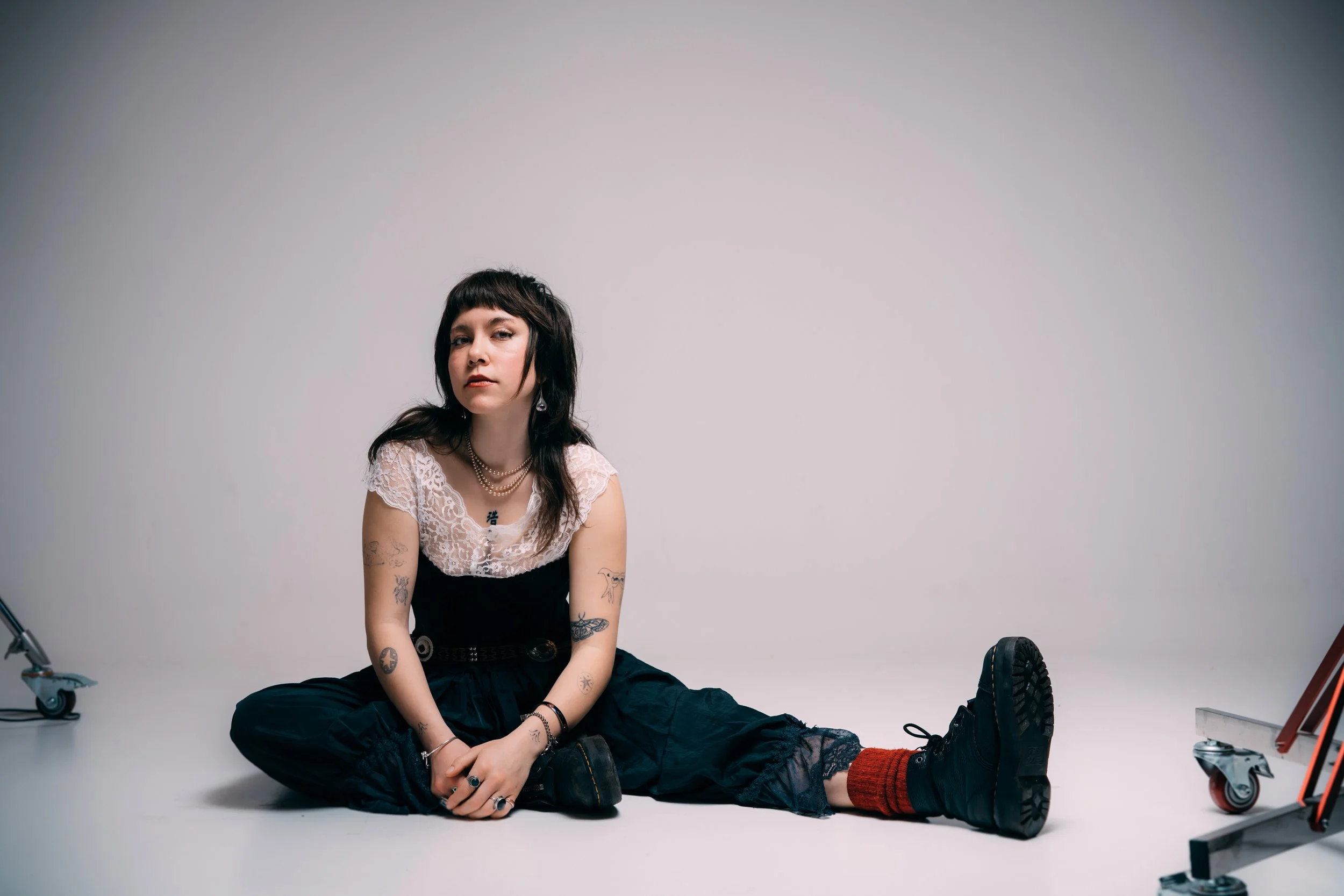 Sophie’s 2025 EP to the core introduced us to the grizzle and rock that she aptly calls “tender bubble grunge”. Which, looking at her two outfits, can easily be described that way as well. There’s a bit of edge, mystery, and tenderness in Sophie that reflects in her music.