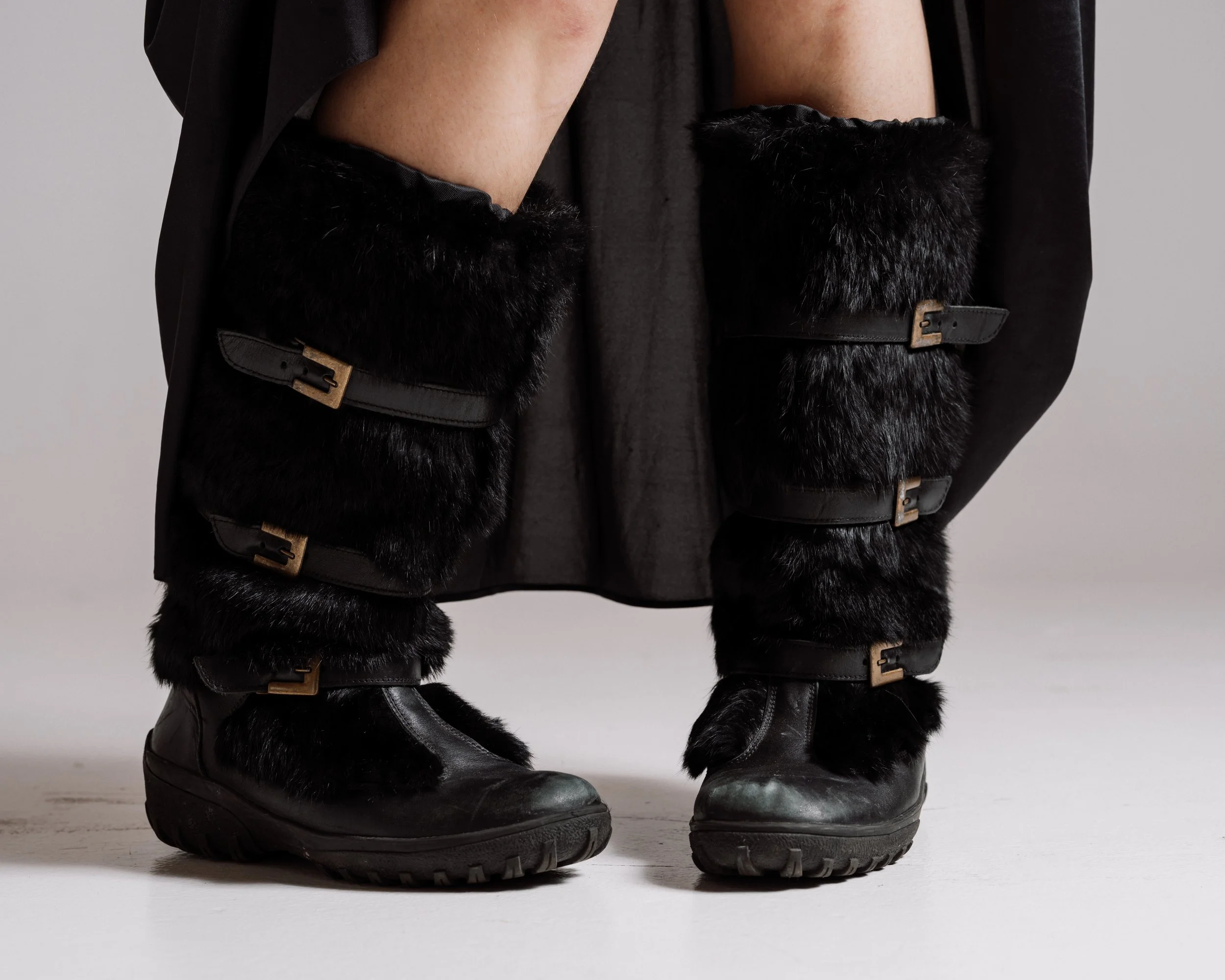 Grounding the entire look are heavy black fur boots, practical and slightly worn, anchoring the outfit in something real and natural based. She found them at the Duluth Savers and realized they were made in Italy with real rabbit fur. She even has a hunch they could be Prada.