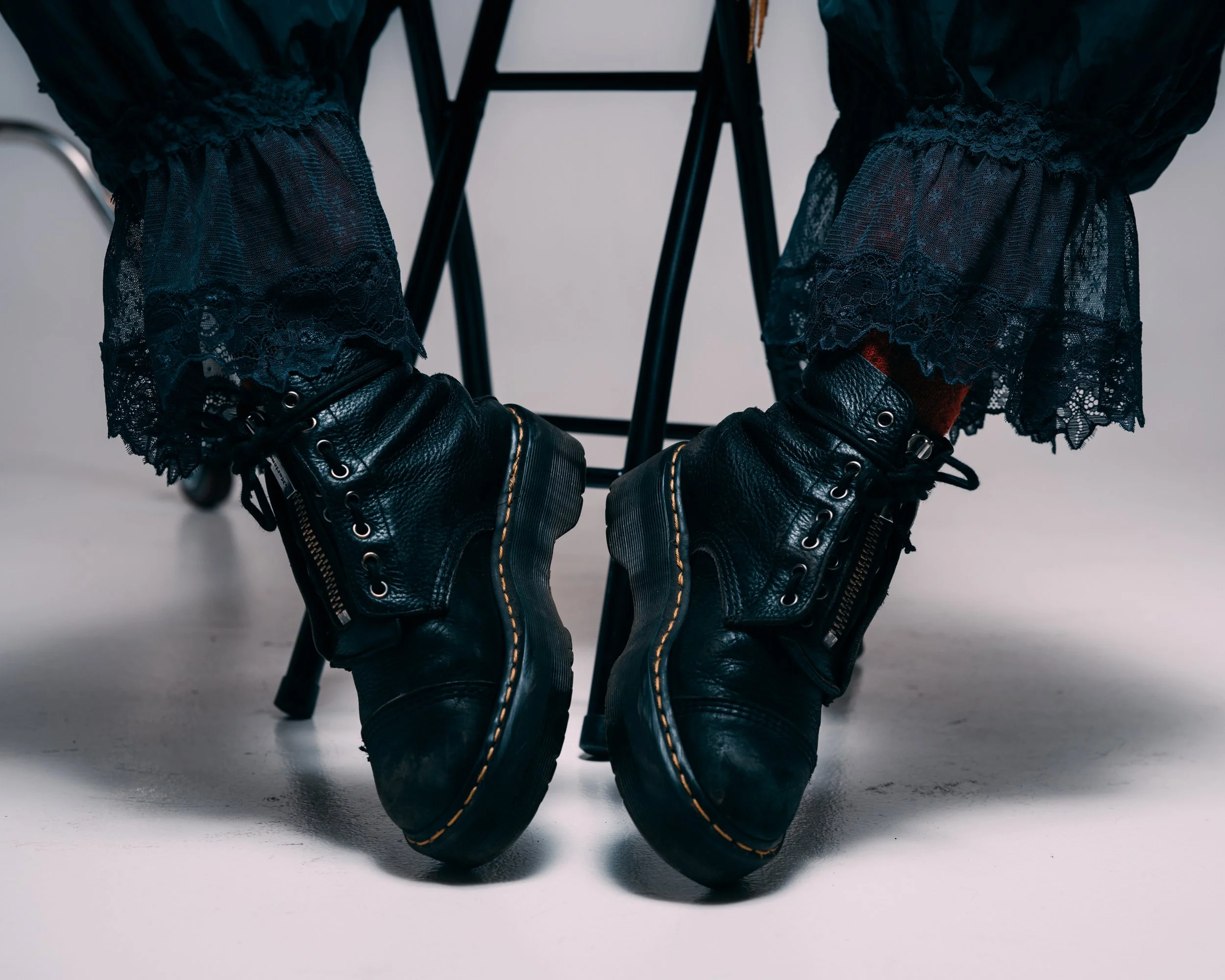 Her second outfit shifts the tone but keeps the same foundation. The silhouette leans more romantic, almost gothic, but it avoids feeling overly polished. Anchored by Doc Marten boots that she’s worn every single day since she was 15, Sophie ties the laces around the ankle. This is a tribute to Patti Smith who did that all the time. The pop of red textured wool socks adds warmth and weight to the look.